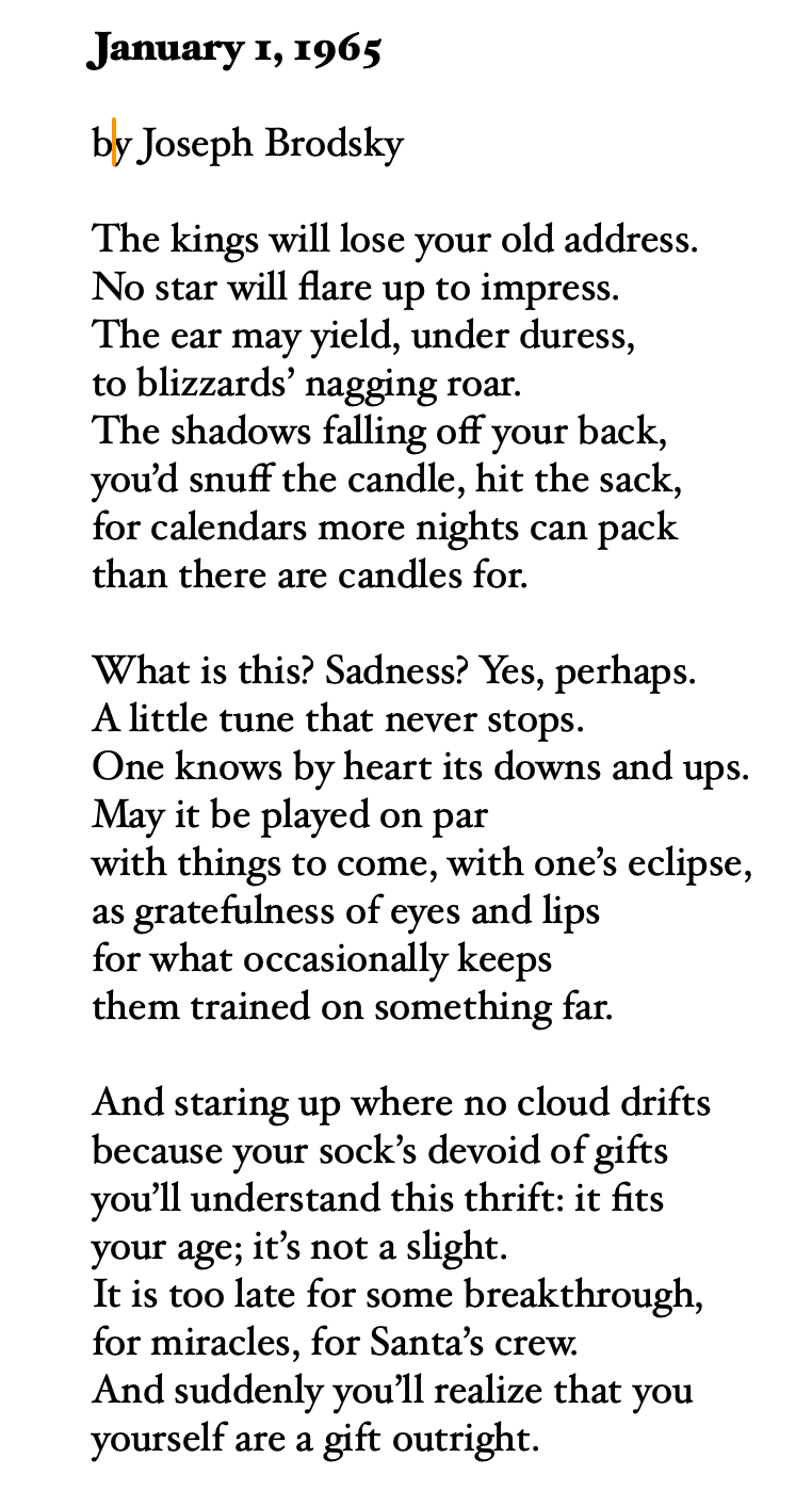 Of course I looked up poems about resolutions, and I found this poem by Joseph Brodsky, which I place here less for itself than for an essay Alex Estes wrote about it, in which he reflects on his long-standing tradition of rereading Brodsky’s poem every year. Though Estes admits to an initial misreading of the poem, his understanding has changed and deepened over time.